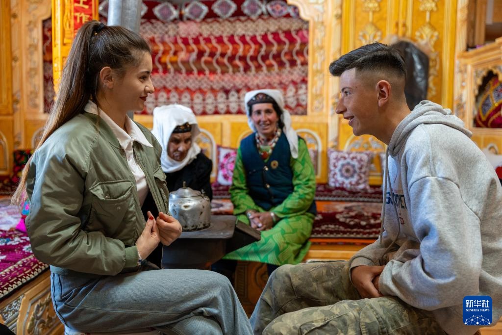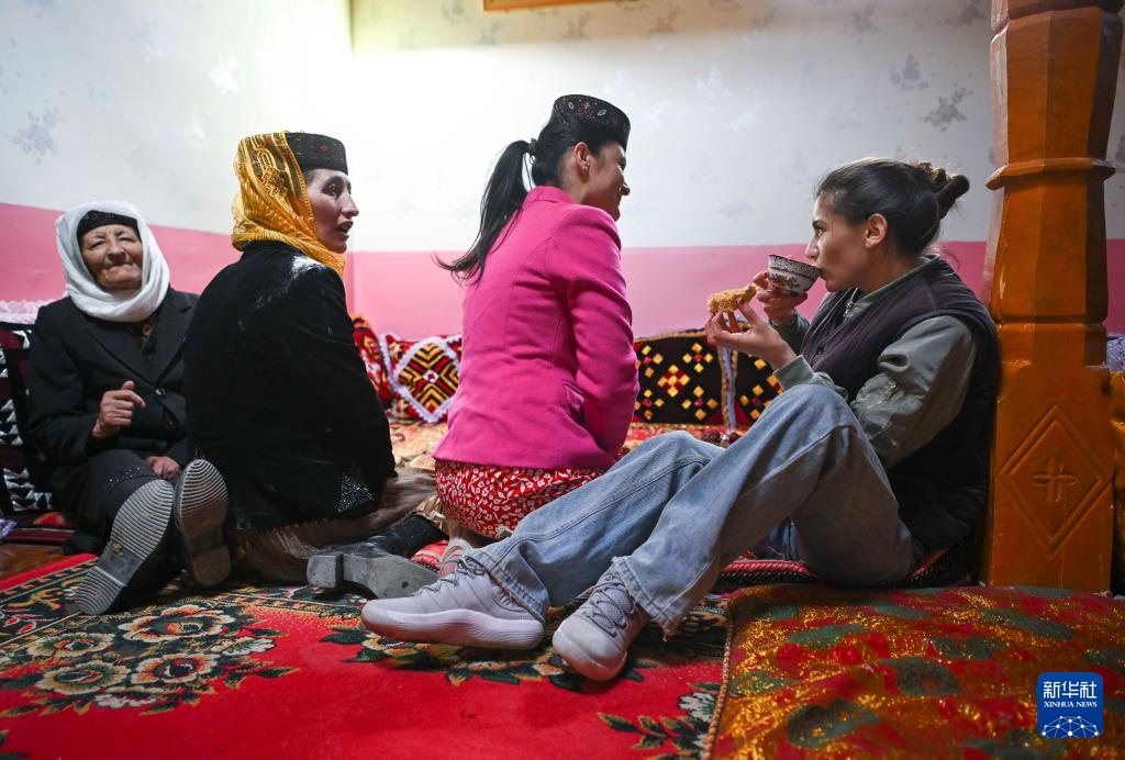 在新疆塔县塔什库尔干乡萨热吉勒尕村,正值塔县“迎春节”,阿曼古丽·瓦比克(右一)在亲戚家与长辈们喝茶聊天(3月21日摄)。