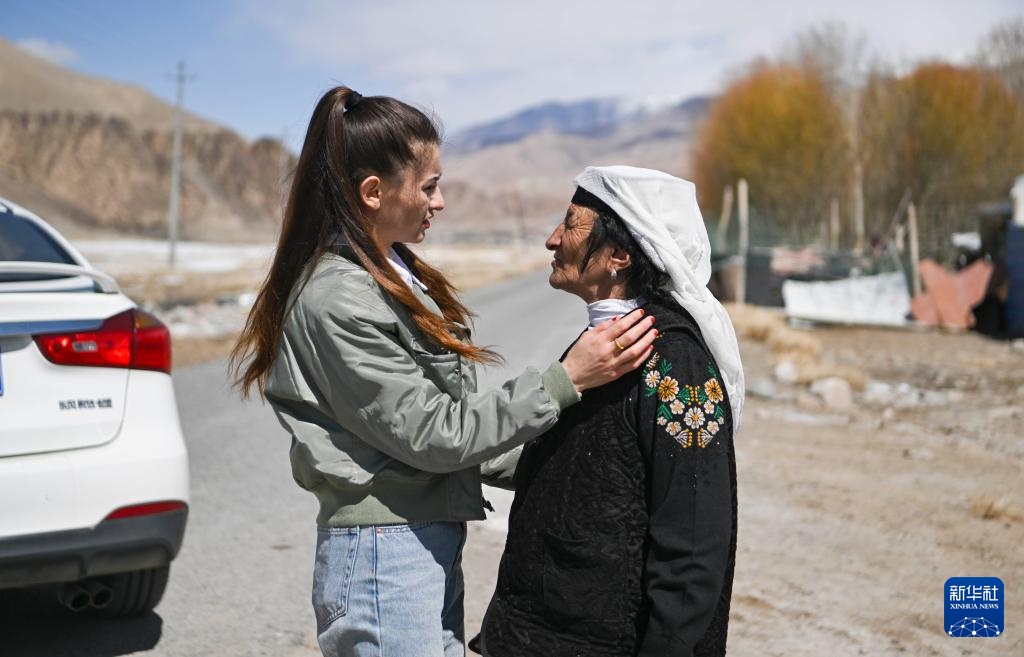 在新疆塔县塔什库尔干乡萨热吉勒尕村,阿曼古丽·瓦比克(左)返回县城演出前,和奶奶话别(3月21日摄)。