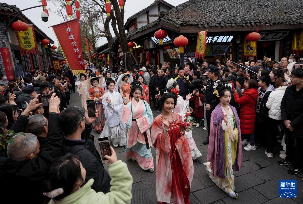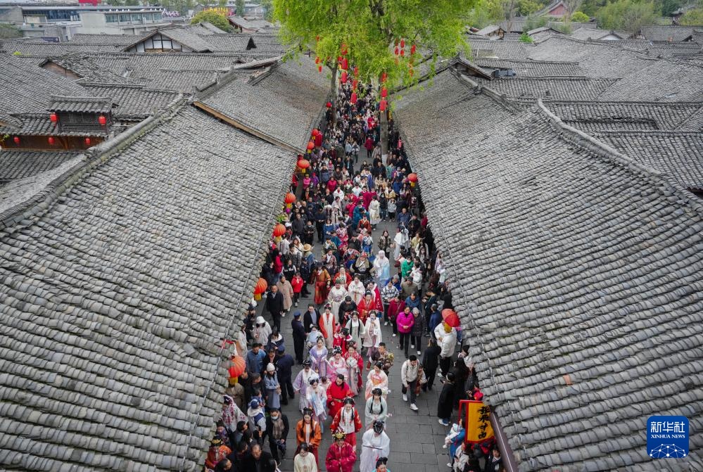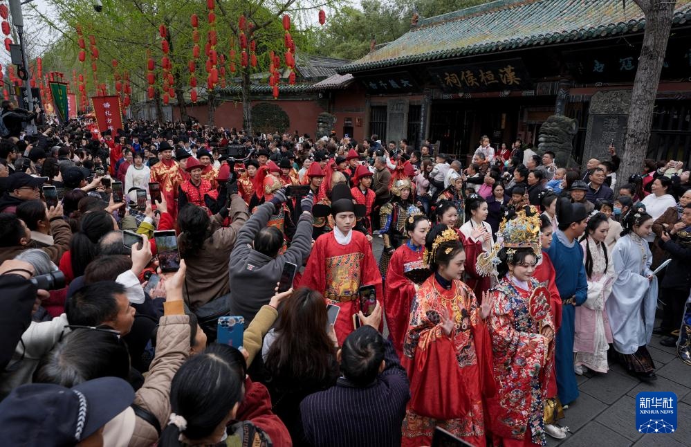 3月29日,婚礼方阵的巡游队伍通过阆中古城汉桓侯祠。