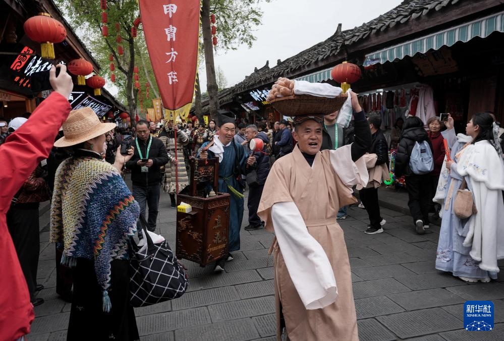 3月29日,非遗货郎方阵的巡游队伍在阆中古城澄清门展演。