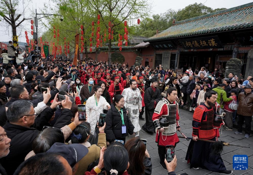 3月29日,三国方阵的巡游队伍通过阆中古城汉桓侯祠。