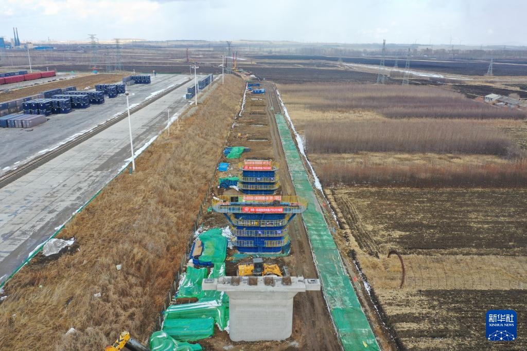 这是3月29日拍摄的黑龙江省佳木斯至同江铁路扩能改造工程施工现场(无人机照片)。