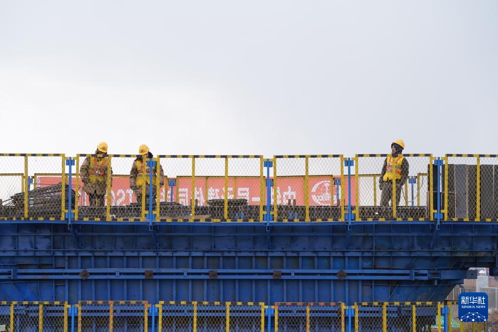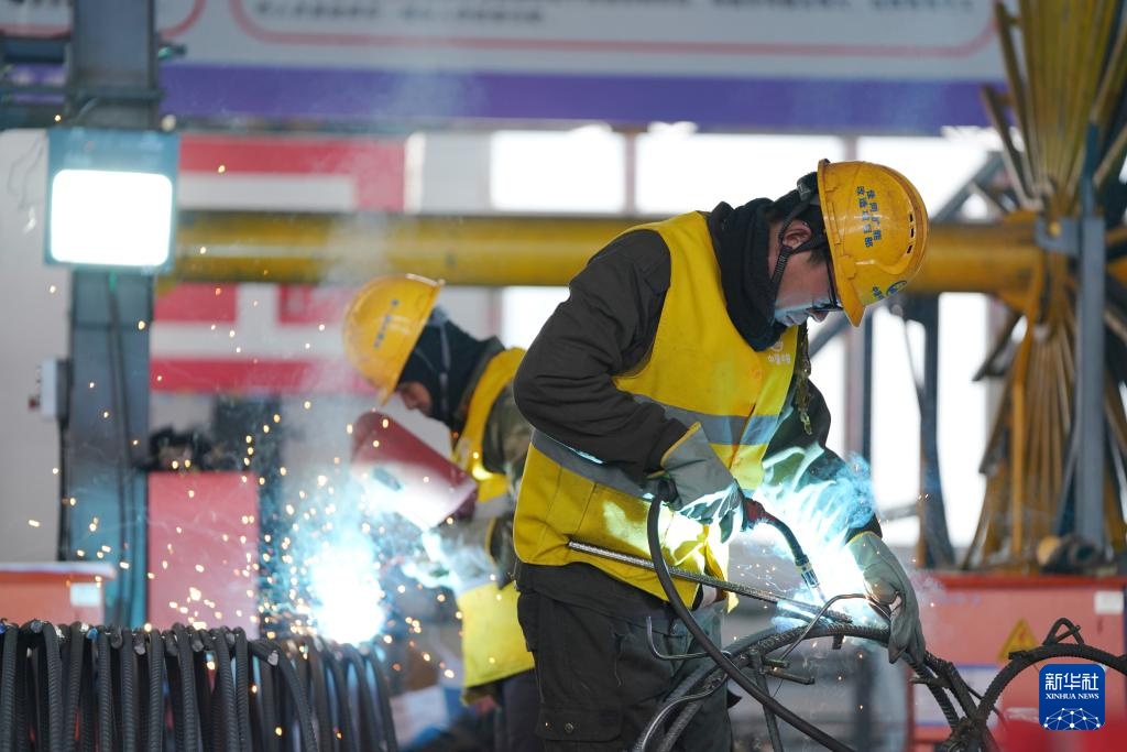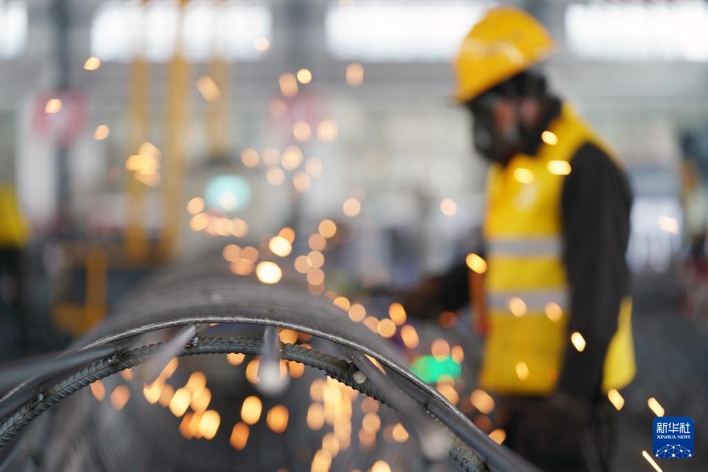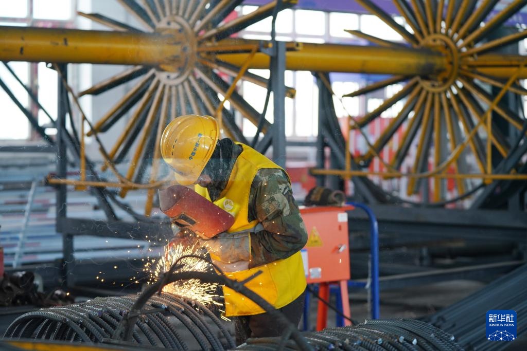 3月29日,工人在黑龙江省佳木斯至同江铁路扩能改造工程钢筋加工厂进行焊接作业。