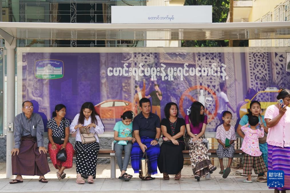 3月30日,市民在缅甸仰光的一处公交站等候公交车。