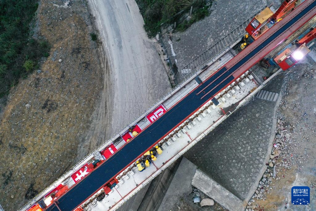 3月31日,工人在贵州瓮马铁路南北延伸线姜家坪大桥上铺设轨道(无人机照片)。