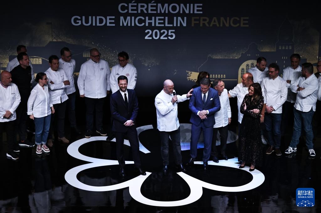 3月31日,在法国梅斯市举行的2025《米其林指南》法国版发布典礼现场,获颁米其林三星的法国厨师雨果·洛埃林热(前右二)发表感言。