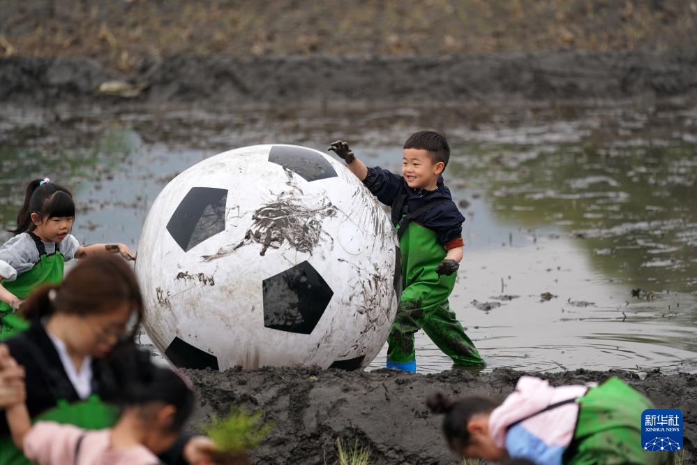 小朋友在太原市晋源区北大寺村的稻田里玩耍(2024年5月4日摄)。