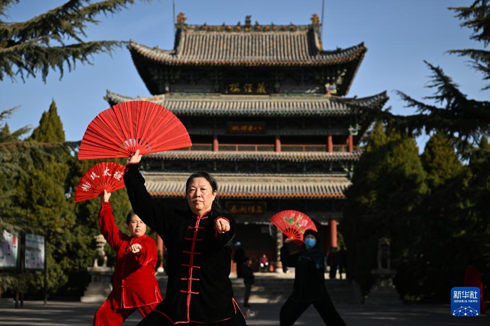 市民在太原市迎泽区迎泽公园练习太极扇(2023年3月1日摄)。