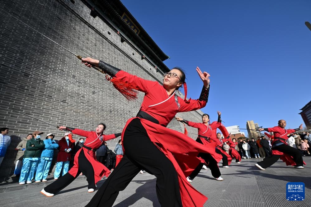 在太原市五一广场,武术爱好者在武术展演活动上表演(2月12日摄)。