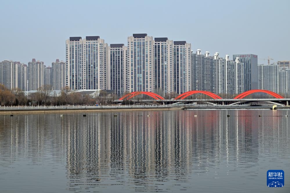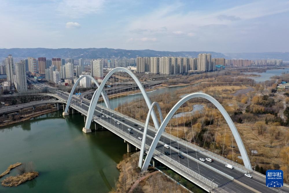 这是太原市漪汾桥及汾河景色(2月21日摄)。
