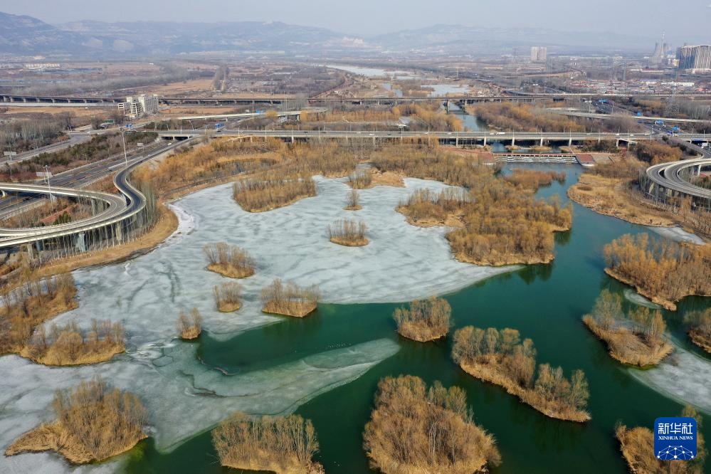 这是太原市汾河湿地(2月19日摄,无人机照片)。