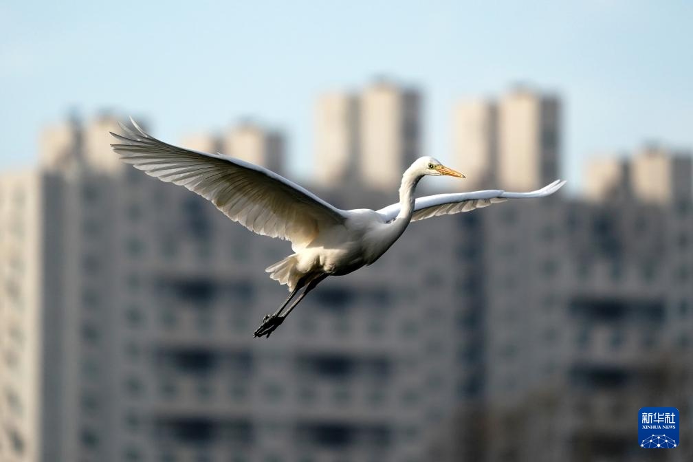 白鹭在太原市汾河上空飞翔(1月1日摄)。