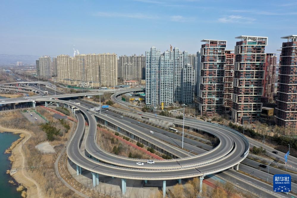 车辆在太原市北中环桥上行驶(2月20日摄,无人机照片)。