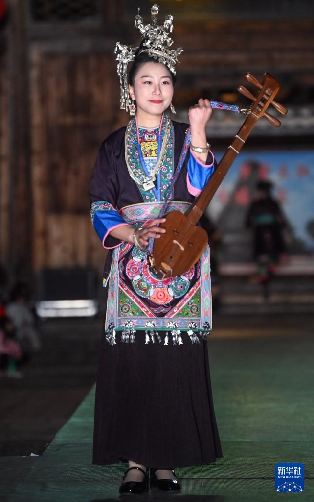 3月31日,在三江侗族自治县鼓楼广场,侗族群众在T台上展示民族服饰。