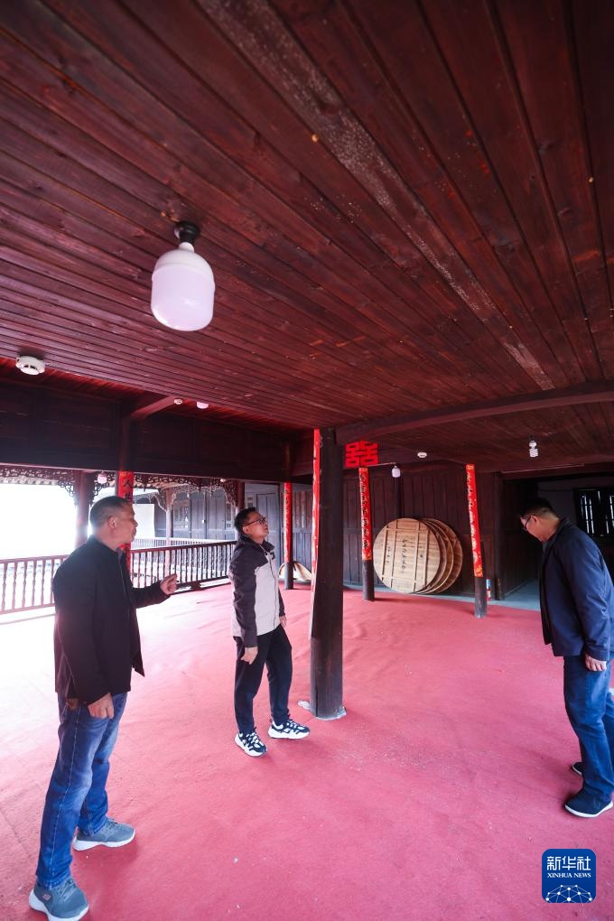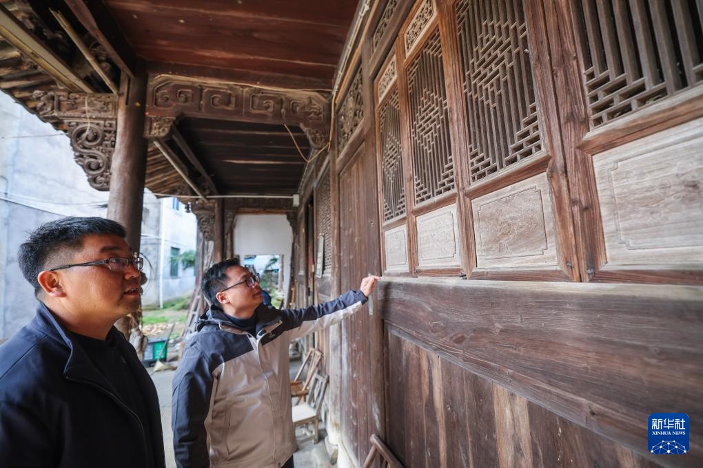 4月1日,岭北镇文化特派员、浙江工业职业技术学院的讲师李亚(右)与岭北镇党委委员楼炳在查看古建筑的维保现状。