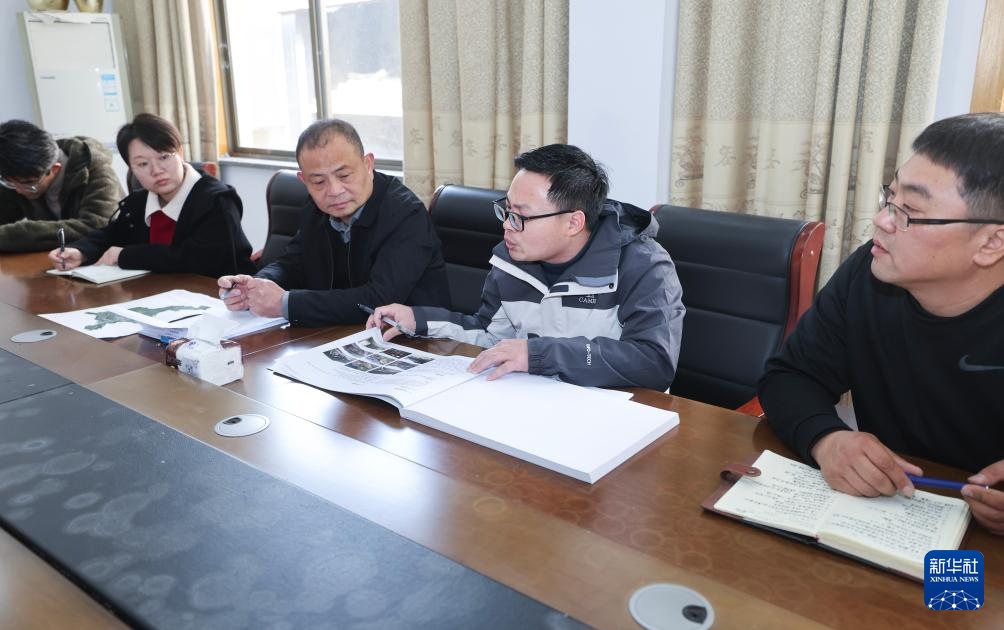 4月1日,岭北镇文化特派员、浙江工业职业技术学院的讲师李亚(右二)与岭北镇、村干部以及村文保员在岭北周社区党群服务中心开展古建筑保护座谈会。