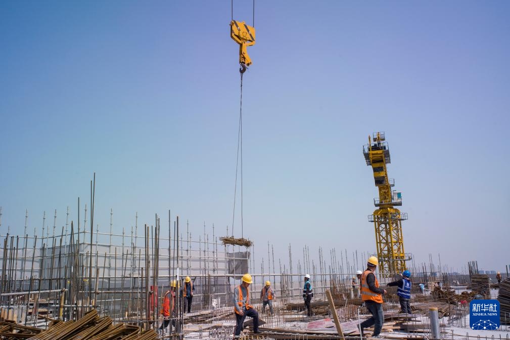 4月1日,工人在复旦大学附属中山医院青浦新城院区一期工程建设项目主楼楼顶进行钢筋支架底座施工。