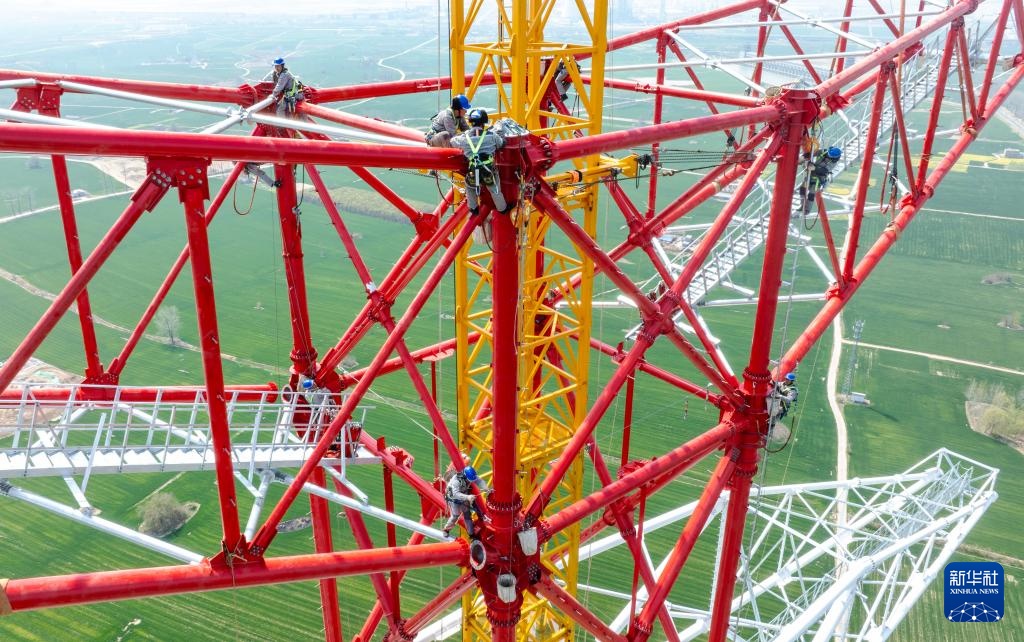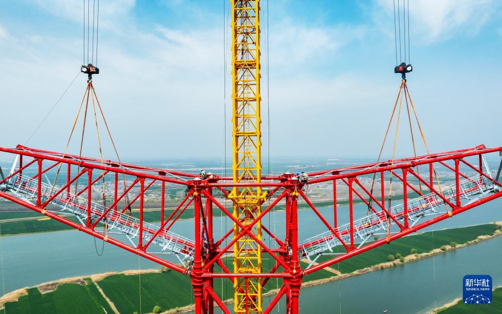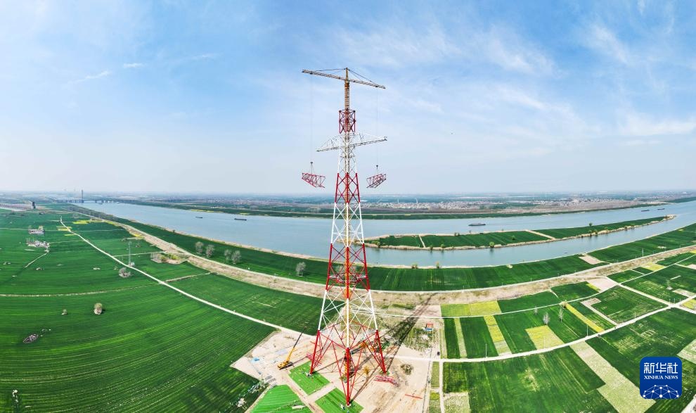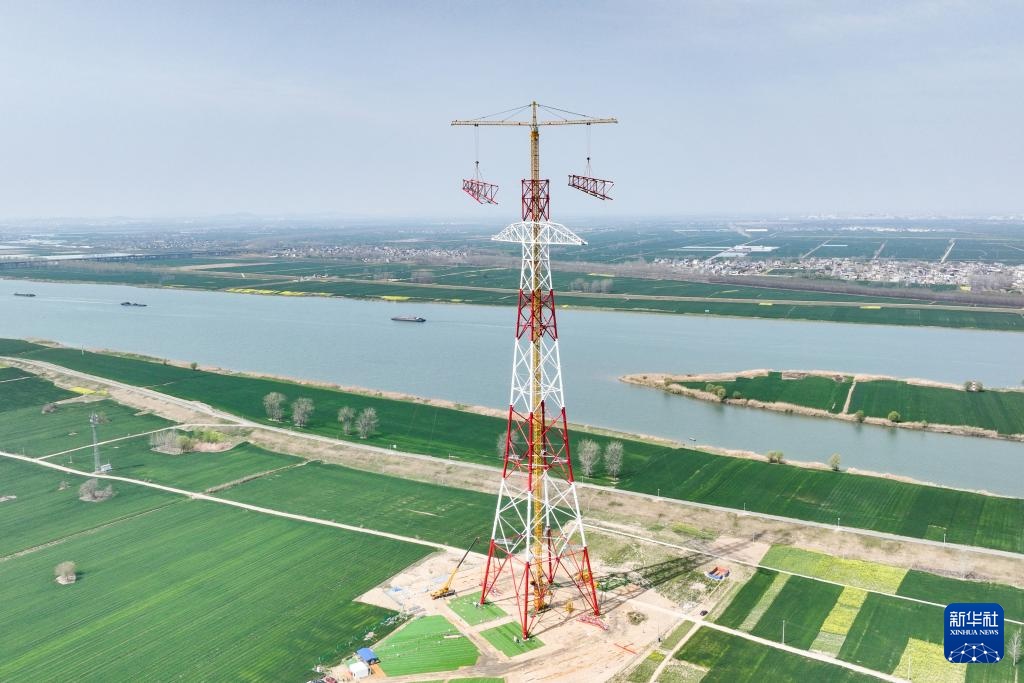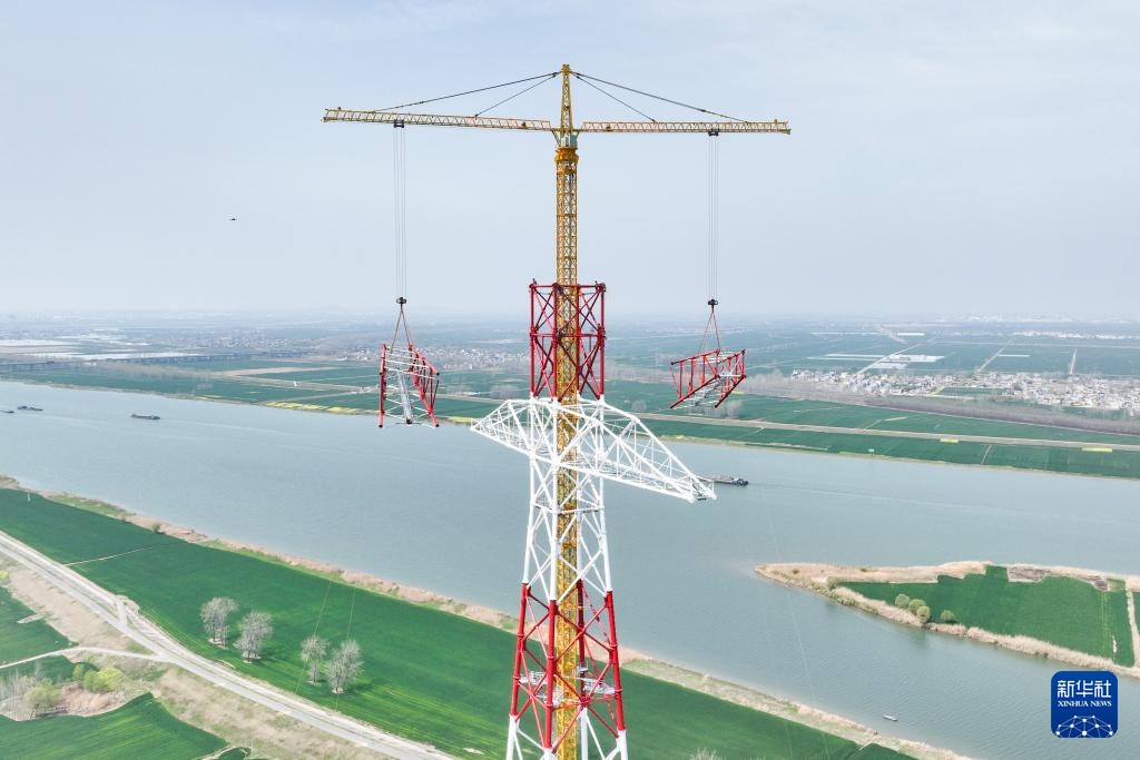 4月1日,在安徽省滁州市凤阳县淮河边,安徽送变电工程有限公司施工人员在高空进行输电塔封顶作业(无人机照片)。