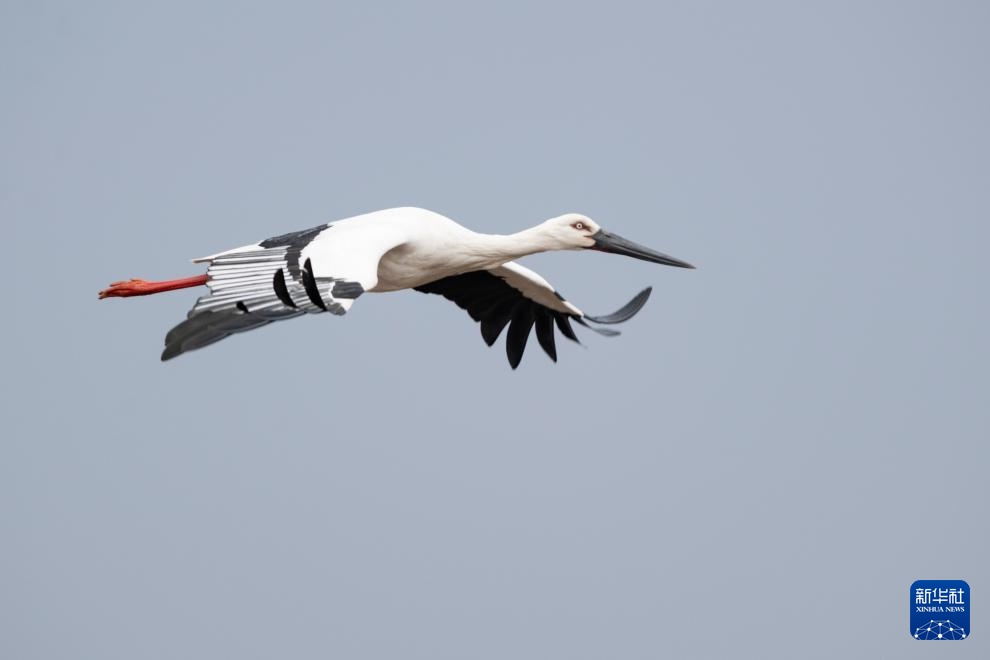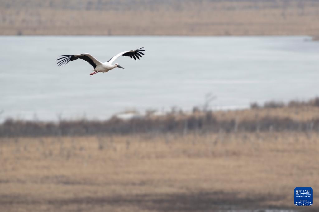 这是4月1日拍摄的兴凯湖国家级自然保护区内的东方白鹳。