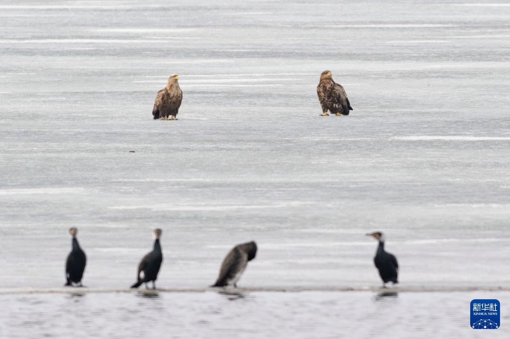 这是4月1日拍摄的兴凯湖国家级自然保护区内的白尾海雕(上)与普通鸬鹚。