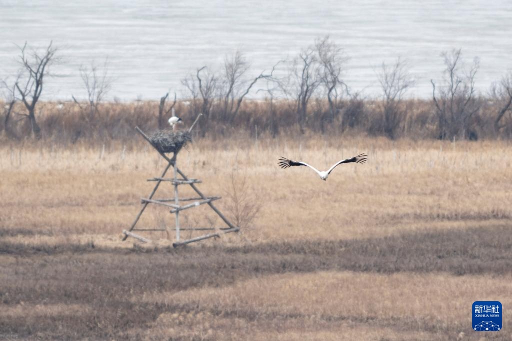 4月1日,在兴凯湖国家级自然保护区内,东方白鹳从人工巢穴中起飞。