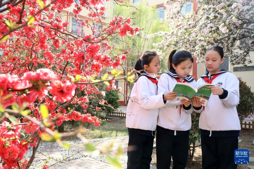 4月2日,天津市滨海新区塘沽实验小学学生在校园里快乐阅读。