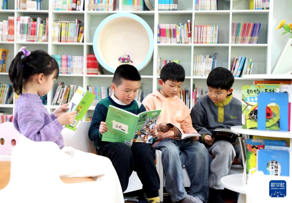 4月2日,河南省沁阳市实验小学学生在校园“书吧”阅读图书。