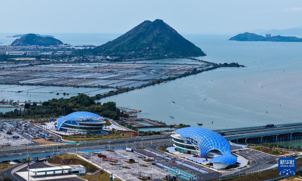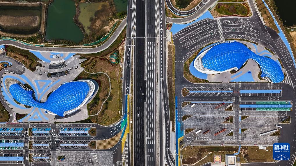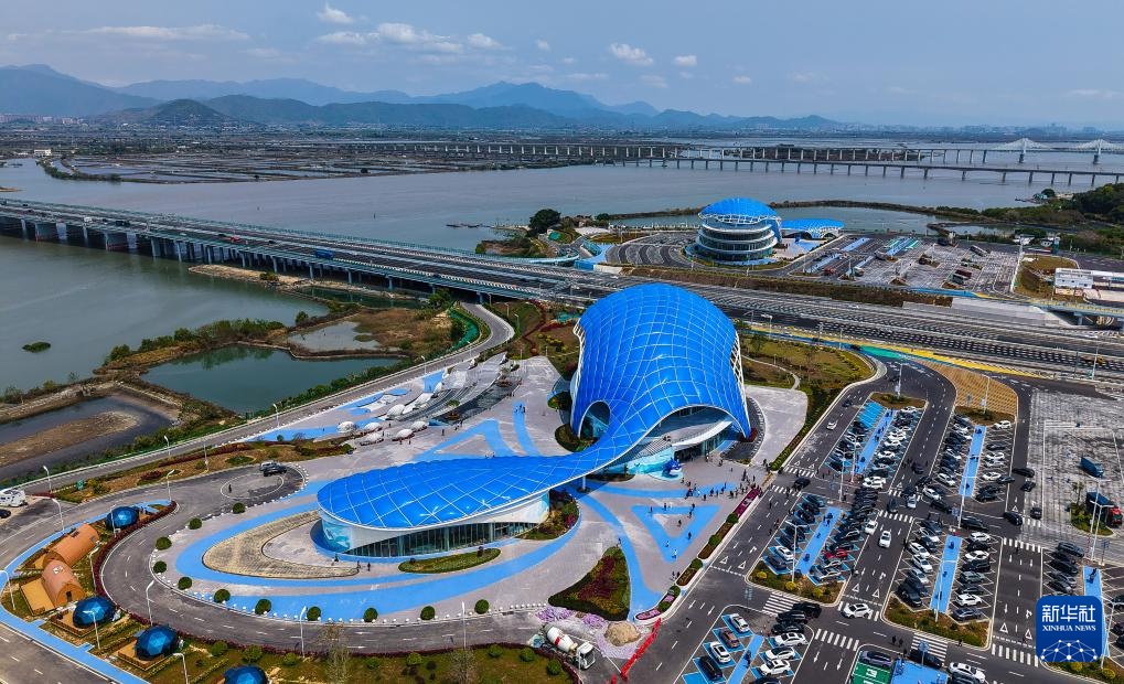 深汕西高速长沙湾服务区“蓝鲸天幕”外观(4月2日摄,无人机照片)。