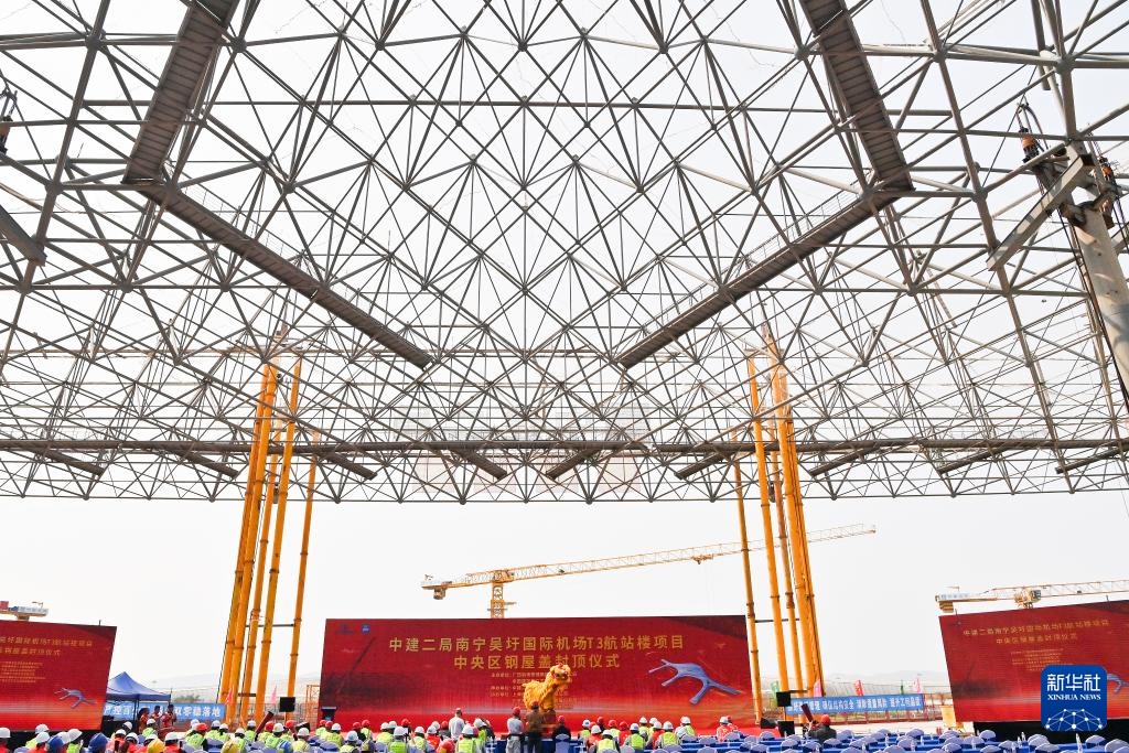 这是4月2日拍摄的南宁吴圩国际机场T3航站楼中央区钢结构主体封顶仪式现场。