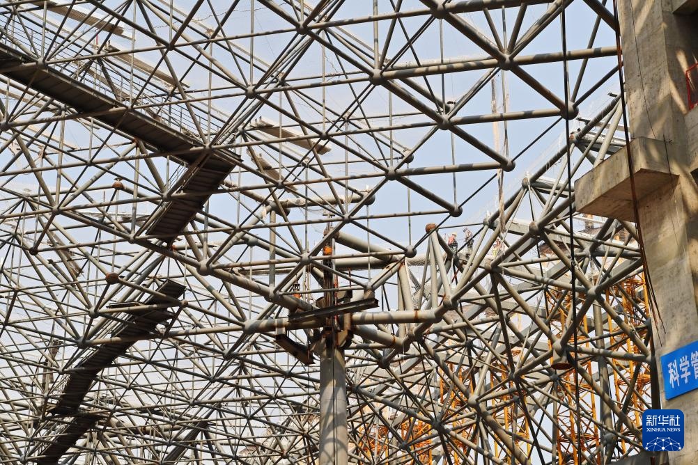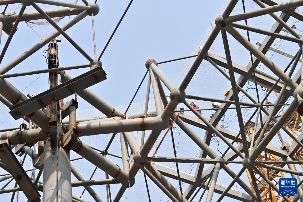 4月2日,建设者在南宁吴圩国际机场T3航站楼中央区钢结构屋盖上施工。