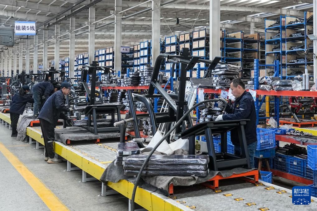 4月2日,在山东迈宝赫健身器材有限公司,工作人员生产健身器材。