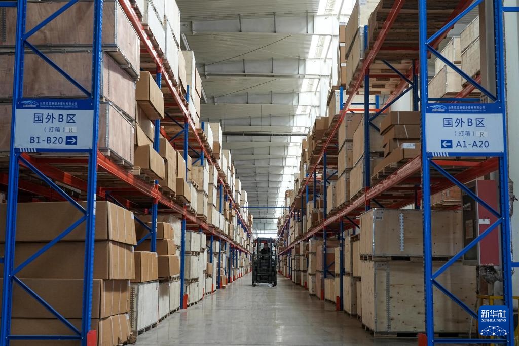 4月2日,在山东迈宝赫健身器材有限公司,工作人员运送商品。