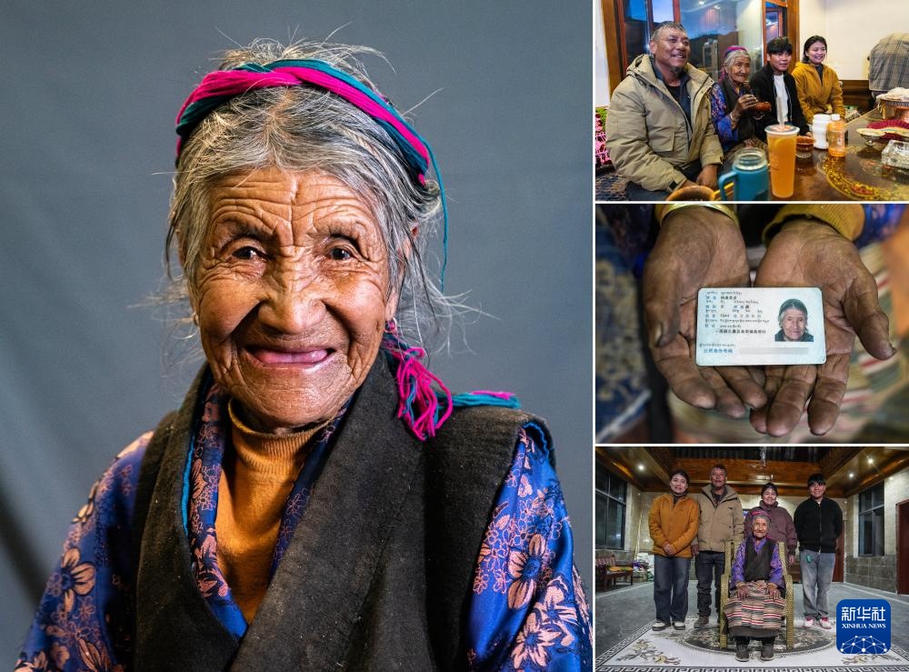 右下:格桑美多老人(前)和家人的合影(3月12日,新华社记者 晋美多吉 摄)。