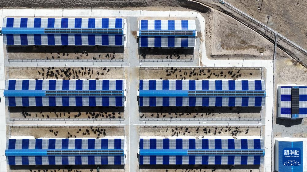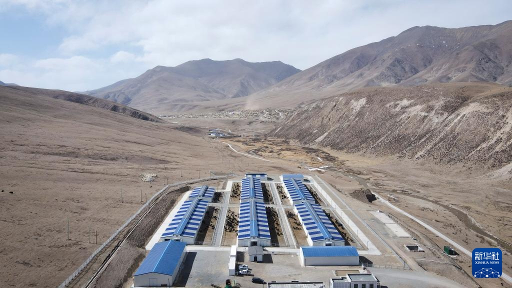 这是4月2日在青海省玉树藏族自治州玉树市拍摄的牦牛标准化养殖综合示范基地(无人机照片)。