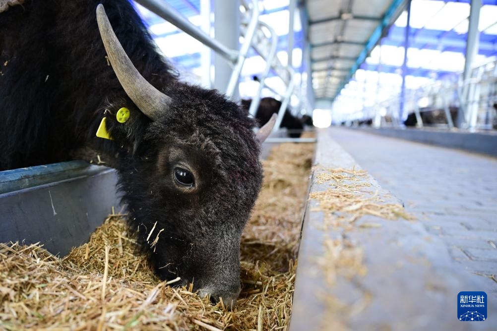 4月2日,工作人员在青海省玉树藏族自治州玉树市牦牛标准化养殖综合示范基地内为牦牛补饲。