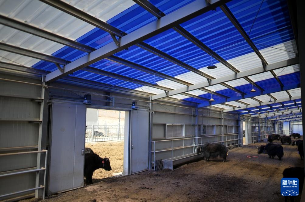 4月2日,在青海省玉树藏族自治州玉树市牦牛标准化养殖综合示范基地,工作人员在查看棚舍。