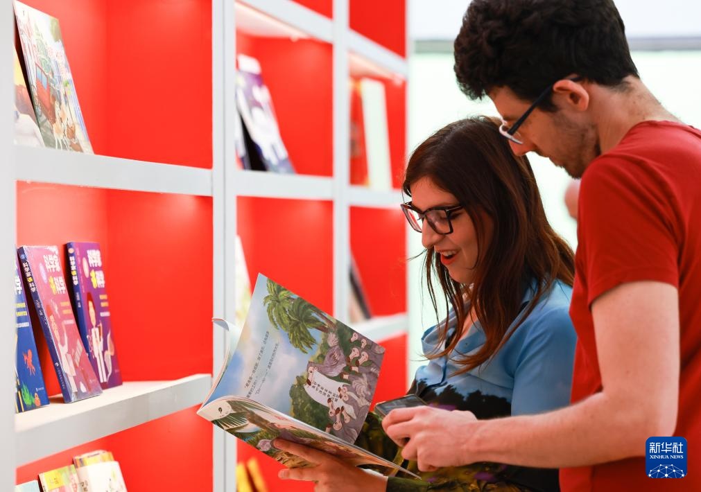 4月1日,在意大利博洛尼亚举行的第62届博洛尼亚童书展上,参观者在中国展区阅读图书。