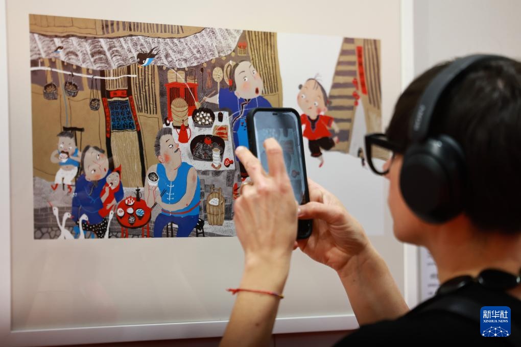 4月1日,在意大利博洛尼亚举行的第62届博洛尼亚童书展上,参观者在中国插画展区拍照。