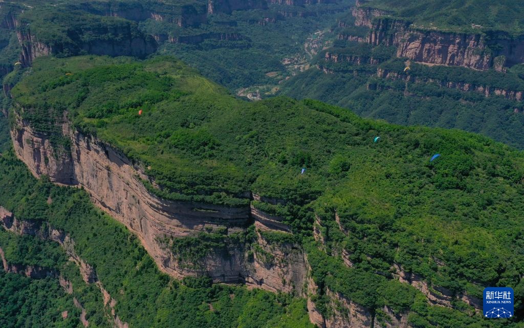 滑翔伞爱好者在河南林州市太行山区飞行(2023年6月8日摄,无人机照片)。