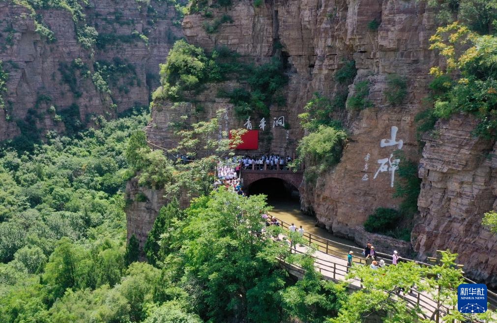悬崖峭壁上的红旗渠青年洞(2023年6月9日摄,无人机照片)。
