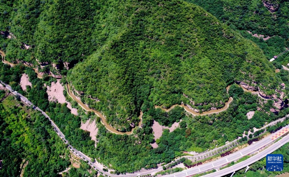 蜿蜒穿行于太行山的红旗渠总干渠(2023年6月9日摄,无人机照片)。