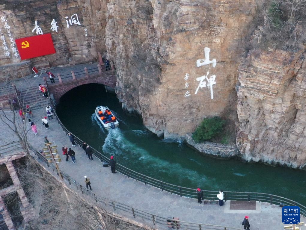 3月18日,游客在红旗渠风景区青年洞附近游玩。