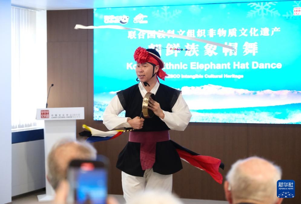 4月4日,在瑞士伯尔尼中国文化中心举行的“你好!中国”吉林省文旅推介会上,演员表演“象帽舞”。
