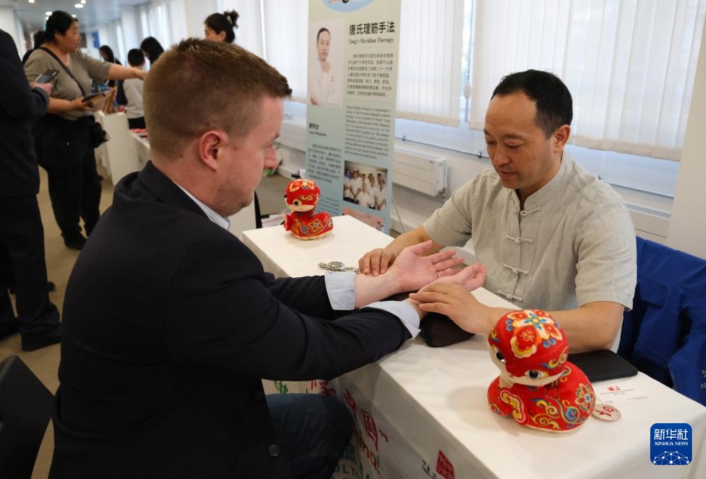 4月4日,嘉宾在瑞士伯尔尼中国文化中心举行的“你好!中国”吉林省文旅推介会上体验中医把脉。
