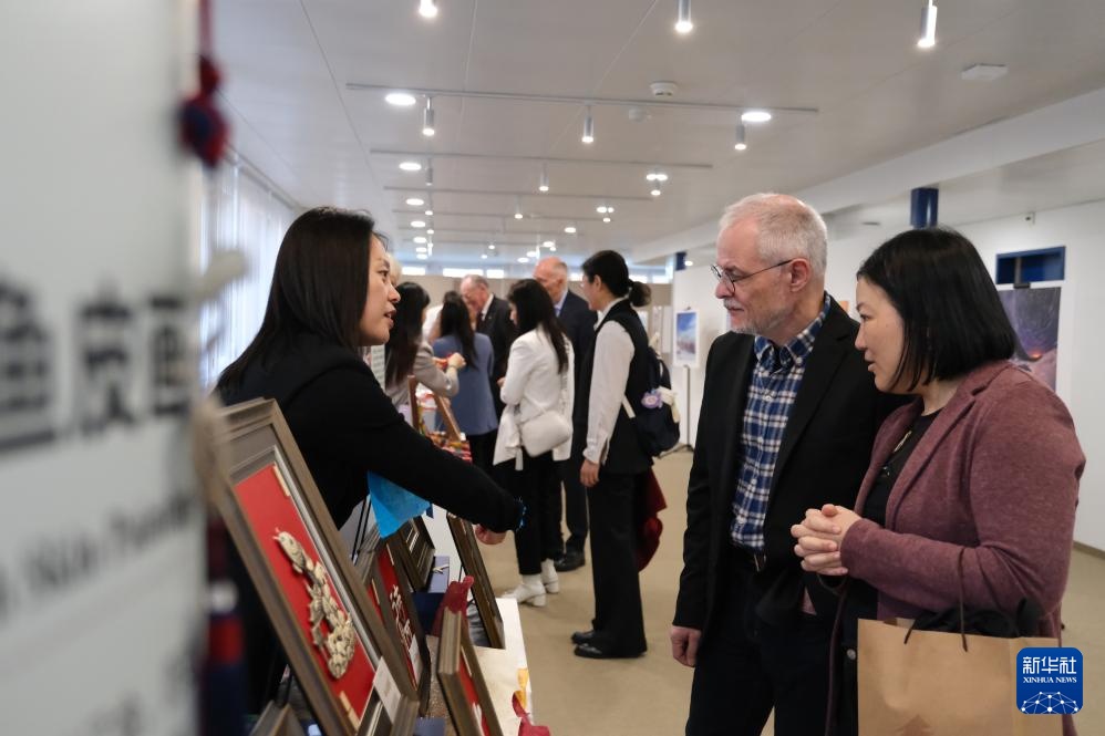 4月4日,在瑞士伯尔尼中国文化中心举行的“你好!中国”吉林省文旅推介会上,非遗传承人向嘉宾介绍鱼皮画制作技艺。
