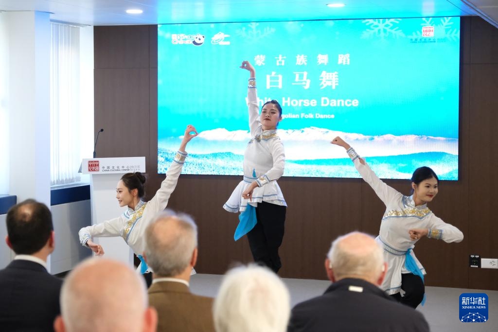 4月4日,在瑞士伯尔尼中国文化中心举行的“你好!中国”吉林省文旅推介会上,演员表演“白马舞”。