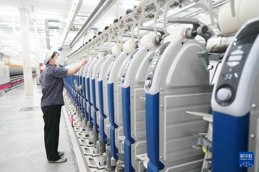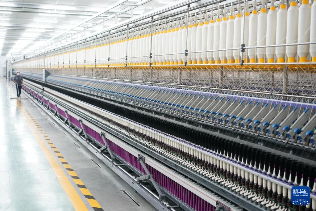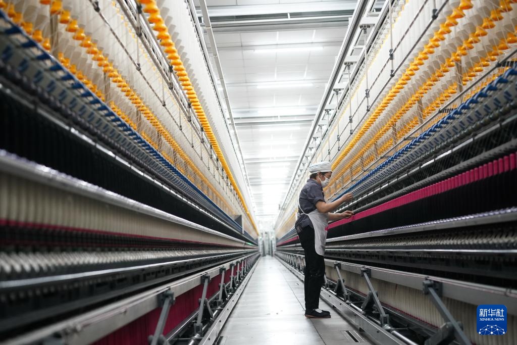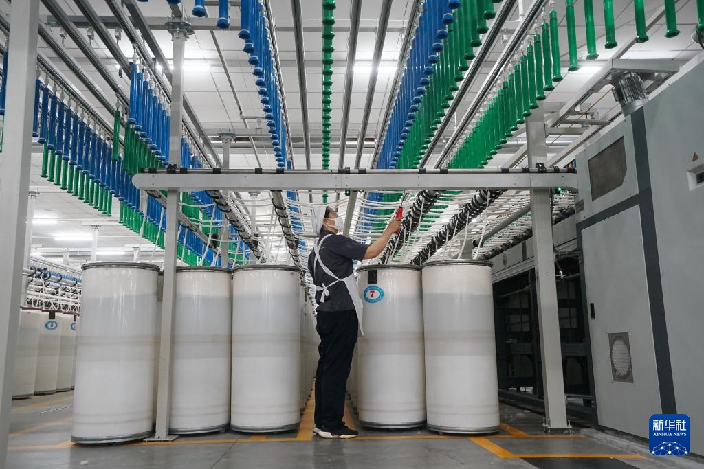 4月5日,工人在江苏泰达纺织科技有限公司智慧化纺纱工厂作业。