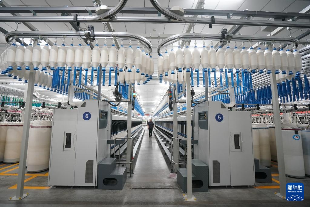 4月5日拍摄的江苏泰达纺织科技有限公司智慧化纺纱工厂生产场景。