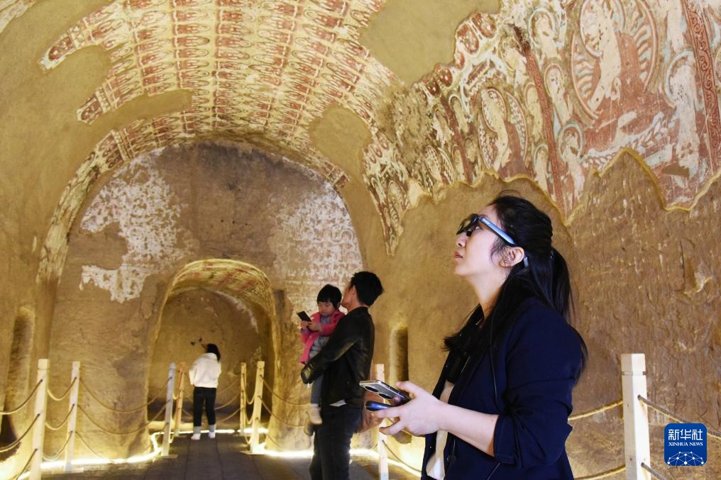 4月5日,在新疆吐鲁番雅尔湖石窟里,游客在欣赏壁画。