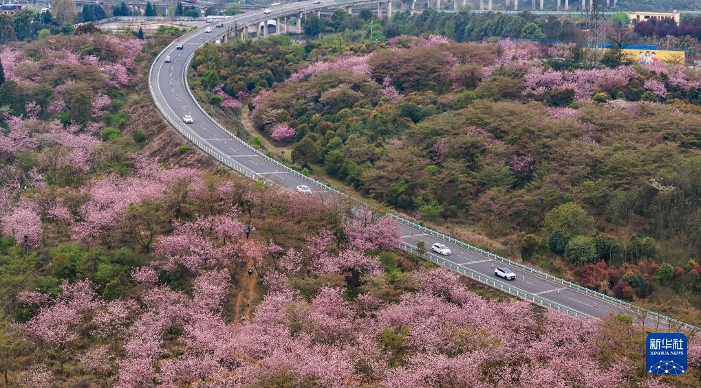 清明时节,贵州省贵阳市清镇市红枫湖镇右二村公路旁的樱花、海棠花竞相绽放,道路与花海相映,人们驱车前来踏青游玩,感受美好春光。
